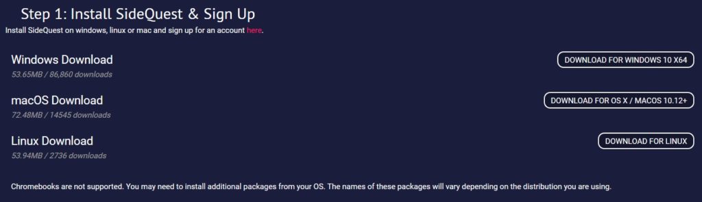 1 – Téléchargez et installez Sidequest, qui est trouvable ici, en utilisant le lien correspondant à votre machine.
