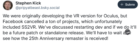 L’abandon du projet ne signifie pas qu’il ne verra jamais le jour. Stephen Kick a précisé que l’équipe a déjà discuté d’un possible retour du développement. Si cela devait arriver, l’adaptation VR prendrait la forme d’un patch post-lancement ou d’une version standalone sortie plus tard.